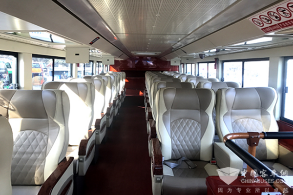 环顾车内,车辆一层前半部分设置有的展示柜十分显眼,内有北京特色小摆件以及旅游宣传画册,展示柜左右两侧分别安放了四人座与两人座的真皮沙发,与车身呼应的桃木色扶手搭配米黄色的真皮座椅,桌面上放置可调温的饮水机。车辆后部顶置了4台屏幕,可进行影音播放。车厢最后排座椅后方还设置了物品箱,便于存放物品。物品展示台的对面即通往二层的台阶,台阶依然沿用桃木色木地板质地,边缘装饰亮黄色边条以防乘客跌滑,此外,黑色橡胶包边的扶手设置的十分人性化,保证了乘客上下台阶的安全性。