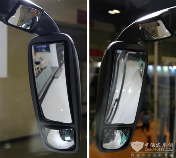 统领客车左右两侧对称设计的组合式外摆后视镜集成了补盲镜和照地镜的功能,美观程度大大增加;独具匠心的悬臂电动折叠功能,让后视镜可以电动折叠怀抱于前挡风玻璃上,对自动车辆清洗车或短空间停车提供了很大的方便性。