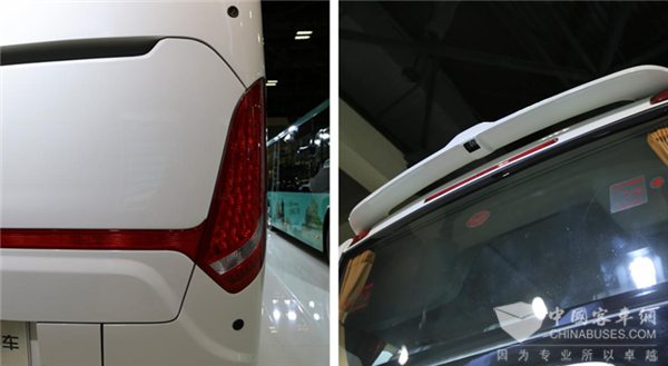 统领客车尾部使用了和前脸一样的U字型造型,左右两侧车灯由发动机罩上的红色装饰横条相连接,更凸显车尾设计的别具一格;尾部均使用LED车灯,使得车灯使用寿命增长。后车窗上方安装了扰流尾翼和顶部刹车灯,扰流翼中间隐藏了后方盲区摄像头,可通过工作台上的显示器来观察车辆尾部盲区的动态。