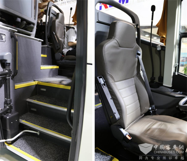 既然号称“统领”,自然需要为乘客提供极尽奢华的乘坐体验。统领客车内部结构采用了错层式设计,整体设计风格为黑色,踏步边缘使用了黄色防滑压条。16项功能可调、可记忆式气悬浮进口司机座椅,可选装车辆偏航震动提醒功能,,配位置可调可折叠的驾驶员扶手,减轻驾驶员的驾驶疲劳,座椅左后方还安装了鹅颈式司机阅读灯和驾驶员麦克风。
