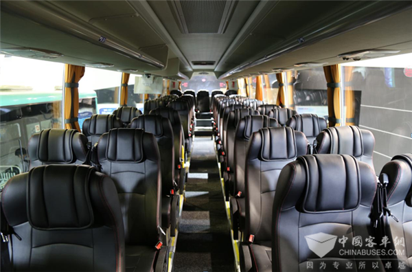 统领客车客舱内部的整体感觉让人耳目一新,座椅采用了全牛皮豪华商务座椅,凸显了统领豪华客车的地位。由于车厢内部结构采用错层式,使得车窗可视范围非常宽阔,光学玻璃完整的将外部的风景呈现在乘客的眼里。