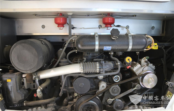 打开统领客车车尾的护板,发动机被排气管、水箱、电机包围在里面,在发动机舱顶上还安放了一对紧急灭火器。统领采用的是斯堪尼亚的DC 13 115 400马力国Ⅴ高压共轨柴油机,在1000-1300转/分时可以达到2100N.m的扭矩。这款发动机能够胜任目前国内大多数重载运输,驱动这样一辆大巴更不在话下。目前装配该机在国内运营的多数为斯堪尼亚P系列和G系列,高度的零件互换性和技术共享使得统领无论是日常维护还是故障维修都非常方便。