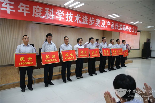 2017年6月20日,宇通客车2016年度科学技术进步奖及产品线奖励表彰大会在宇通工业园隆重召开,本次大会针对宇通2016年度在产品、技术、工艺制造等方面表现出色的技术与研发团队,以及2016年度市场反馈优异的产品研发团队进行表彰,奖金总额高达951万元,其中,科技进步奖497万元,产品线奖454万元。