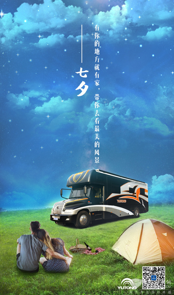 宇通作为客车行业的老大,2017七夕海报围绕的是房车休闲,主题为“有你的地方就有家,带你去看最美的风景”。