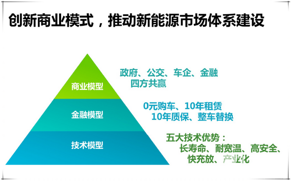 在商业模式的创新上,银隆在市场推广方面,推出了创新共赢的商业模式,该模式建立在银隆钛技术的基础上,具体表现为“零元供车、十年租赁、十年质保、整车替换、四方共赢”。