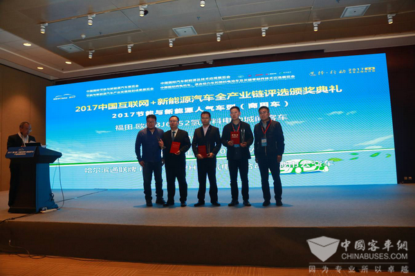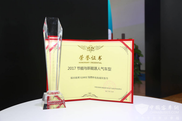 福田欧辉BJ6852氢燃料客车荣获“2017节能与新能源人气车型”奖