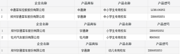 5款校车产品上榜,其中2款中小学生校车、2款小学生校车和1款幼儿园校车。5款校车产品中,宇通有3款6.8米校车上榜,中通客车1款10米校车上榜,牡丹汽车1款5.6米校车上榜。