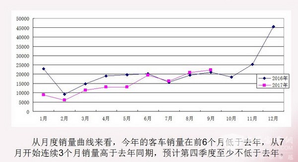 从月度销量曲线来看,今年的客车销量在前6个月低于去年,从7月开始连续3个月销量高于去年同期,预计第四季度至少不低于去年。