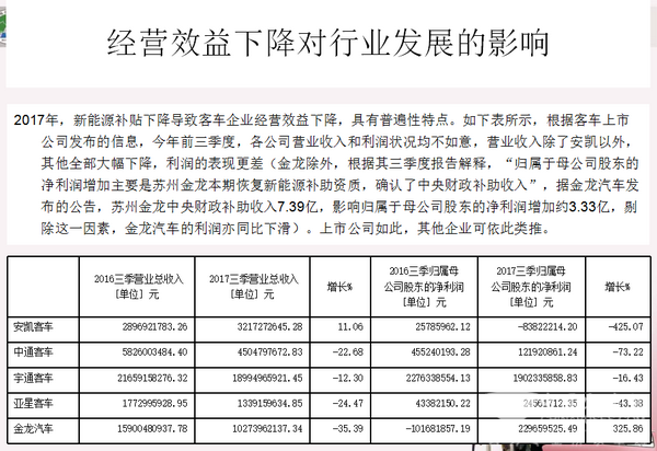 2017年,新能源补贴下降导致客车企业经营效益下降,具有普遍性特点。