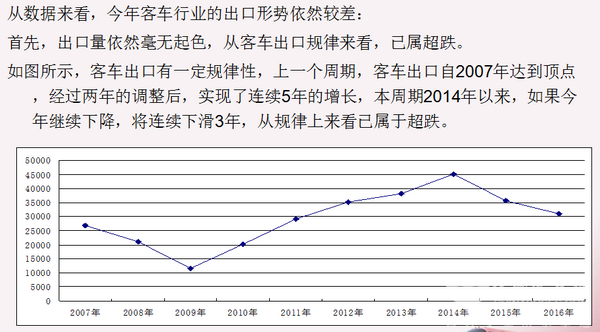 客车出口有一定规律性,上一个周期,客车出口自2007年达到顶点,经过两年的调整后,实现了连续5年的增长,本周期2014年以来,如果今年继续下降,将连续下滑3年,从规律上来看已属于超跌。