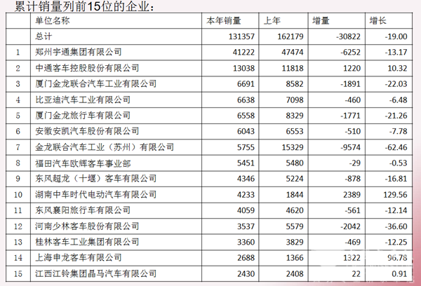 总销量中,大型客车销量54571辆,同比下降3.55%,中型客车销量40565辆,同比下降36.58%,轻型客车销量36221辆,同比下降13%,大型客车表现尚可,中轻型客车遭受重创。