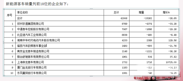 新能源客车销量虽然整体上同比下降26.65%,但仍然有3家企业销量较大、增量较高:湖南中车、烟台舒驰、上海申龙。