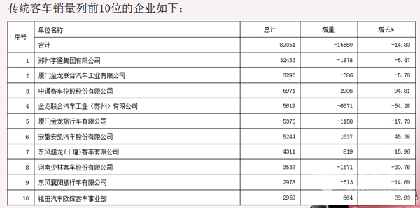 传统客车销量整体同比下降14.83%,有3家企业销量较大、增量较高:中通客车、安徽安凯、福田欧辉。