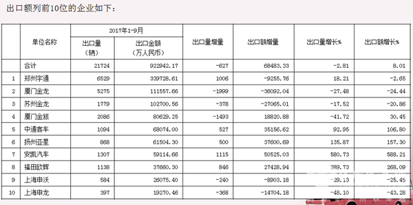 今年涉及出口的企业只有24家,其中11家增长,13家下降,其中,增量在500辆以上的企业有5家:安凯(出口1307辆,增量1115辆)、宇通(出口6529辆,增量1006辆) 、福田(出口1138辆,增量846辆) 、中通(出口1094辆,增量527辆) 、亚星(出口868辆,增量500辆),如上所述,今年1-9月,客车行业的平均降幅高达19%,但以上5家企业的市场表现均领先于行业,出口的贡献不小。