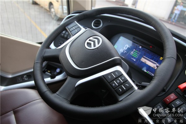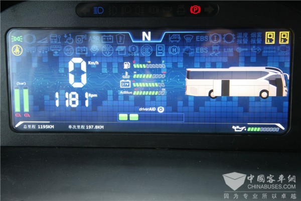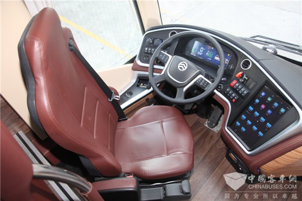 作为试驾者,我最先关注的是驾驶区设计。当看到一部已经旋转好45°等待迎接驾驶者进入的座椅时,估计很多驾驶者会如我一样被这种贴心的设计所打动。由于客车以乘客满意度为主要衡量指标,国内客车产品的设计者会把更多精力放在乘客区,普遍存在着对驾驶区关注度不够的问题。但事实上,驾驶员的工作状态对一辆客车的安全性、经济性和舒适性有着至关重要的影响。从领航者身上我们看到了国内客车在驾驶区设计理念上的改变,除了一款舒适可旋转的空气悬浮座椅,AMT变速器、一键启动装置、电动车窗及后视镜调节、电动遮阳帘、电子驻车制动等自动化配置,都会让驾驶者像驾驶一辆家用车那样轻松。