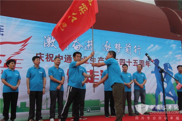 公司庆祝专业生产客车45周年,李树朋董事长为员工代表授旗