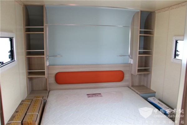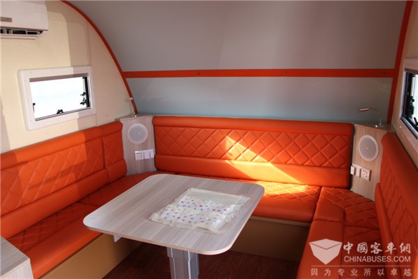 为充分满足房车旅游露营生活的舒适和便捷,该批房车车内设有豪华双人床、环形沙发、整体吊柜、整体卫生间、豪华淋浴装置、冷暖空调、智能电视、冰箱等设施,可以同时满足4个人休息。而为了满足娱乐需求,内配有室内5.1音响、室外卡拉OK系统以及自动麻将桌等娱乐设施。