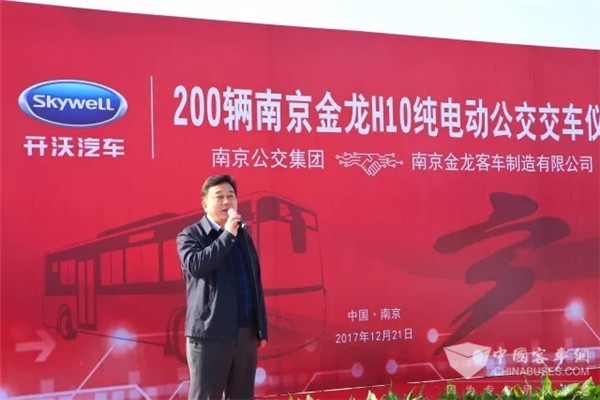 2017年11月2日,南京公交集团开标了1900台纯电动公交车,南京金龙中标487辆,于11月4日正式签订合同。这也是南京明确2020年完成公交电动化后首次大批量采购纯电动公交车。12月21日,南京金龙首批200辆10.5米纯电动公交车正式交付南京公交集团江南公交公司,成为此次中标企业中首家交付的车企,充分体现了南京金龙的技术实力、生产能力和服务诚意。南京市交通局局长陈雷,南京公交集团董事长朱明,南京公交集团江南公交副总经理常青,南京公交集团扬子公交副总经理刘晋祥,开沃新能源汽车集团、南京金龙副总裁樊文堂,开沃新能源汽车集团、南京金龙副总裁诸萍,开沃新能源汽车集团、南京金龙首席技术官张蒙阳出席本次交车仪式。