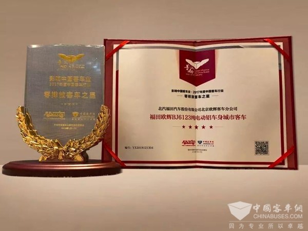 福田欧辉BJ6123纯电动城市客车荣获“零排放客车之星”