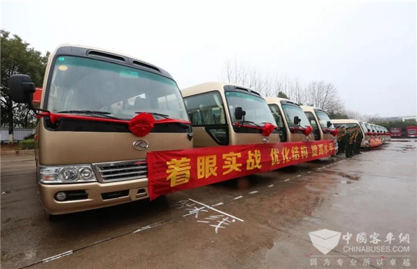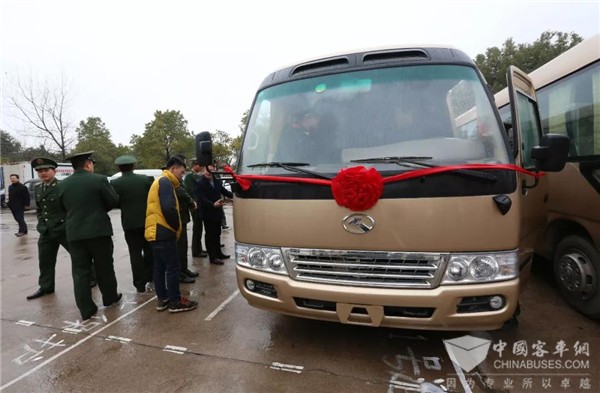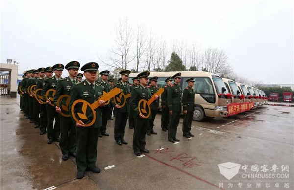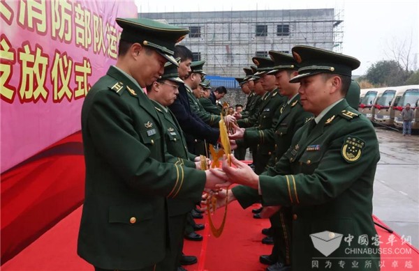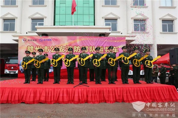 虽然凛冽风霜刮刺脸庞,但参加发车仪式的消防官兵队伍依然英姿飒爽,欢欣鼓舞,士气高涨。仪式上,18个大队代表热情而又庄重地接过18把金龙客车金钥匙。仪式后,这18辆新车发送到各个消防大队,将极大地强化各个大队的作战和应变能力。