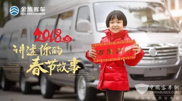以女儿为主角的海报要数金旅客车:娇憨明媚的小女孩站在金旅商务车前,请你“讲述你的春节故事”。