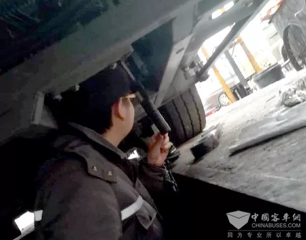 △大年初一,驻点服务工程师聂新煜和王邵祁正在为车辆做春运“体检”。