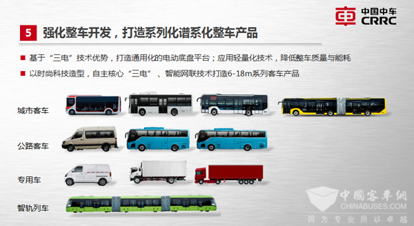基于“三电”技术优势,打造通用化的电动底盘平台;应用轻量化技术,降低整车质量与能耗;以时尚科技造型,自主核心“三电” 、智能网联技术打造6-18m系列客车产品;以通用多功能电动化底盘为载体,结合多场合应用需求,打造2.5t到7.5t的系列专用车产品。