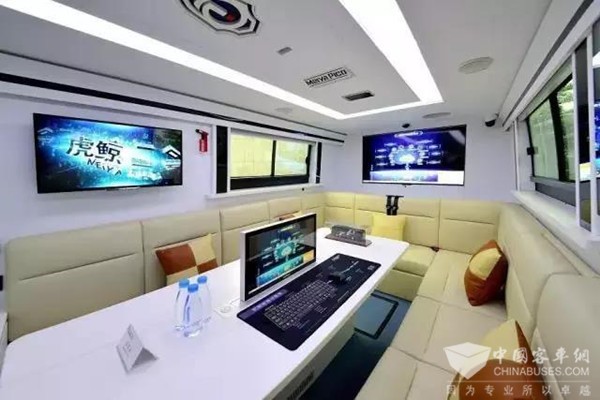 车尾俨然布置成一个小型的会议区,陈设简单却功能齐全。配备有先进的网络系统和无线通讯设备,可进行全方位的网络舆情监测,也能移动指挥,在突发状况发生时,迅速变身临时指挥部。