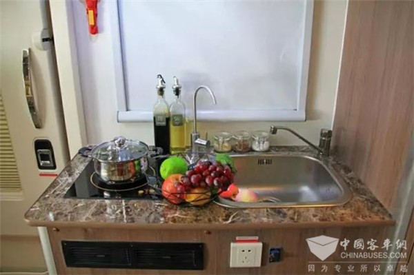 厨房位于进门处,配有车载抽油烟机、电磁炉、微波炉、滚筒洗衣机以及净水器等丰富设施,洗衣、做饭一气呵成,充满家的气息。