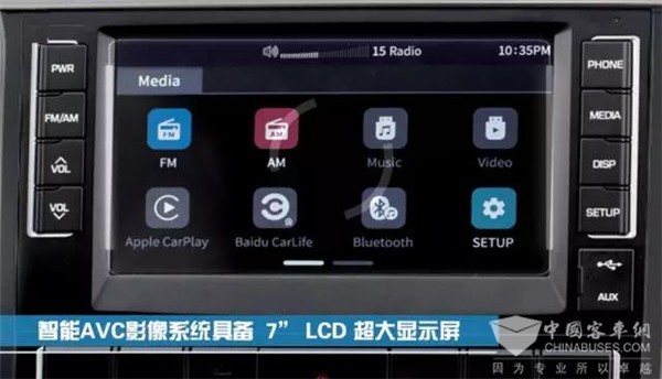 配有7英寸LED大屏AVC装置,确保旅途出行更加轻松有趣。可随时收听广播,也可通过插入U盘或ipod享受大屏看电影,同时还能接入手机数据线,连接蓝牙,实现语音导航、随心听等功能(苹果/安卓系统兼容),另外车队管理系统也在积极研发中。