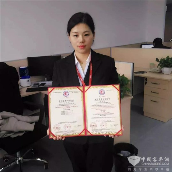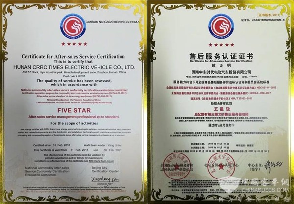 一名售后服务工程师正拿着一本“闪亮”的证书缓缓走来。这就由国家商务部发文,第三方机构北京五洲天宇认证中心认证的“五星级售后服务”证书。该认证意味着中车电动提供的产品和售后服务体系,达到国家最高认证标准。