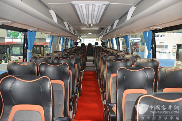 “川流”造型采用欧洲流行的方基调小圆角设计,运用大量反凹流体切割面,整车流畅大气而又显得精致时尚。前围采用三块布局冲压件,全敞开式设计,方便检修;搭配新款豪华大灯和LED日行灯,科技感更强,实用性更佳;后围大灯下沿与保险杠形成独特的U字形,视觉上浑然一体;侧围飘带式装饰件的应用,点缀出刚中带柔,灵动飘逸之感。另外,A柱采用暗柱设计,使得前围玻璃和侧围玻璃的衔接过渡更加顺畅,有效改善传统城市公交A柱前倾的视觉效果。