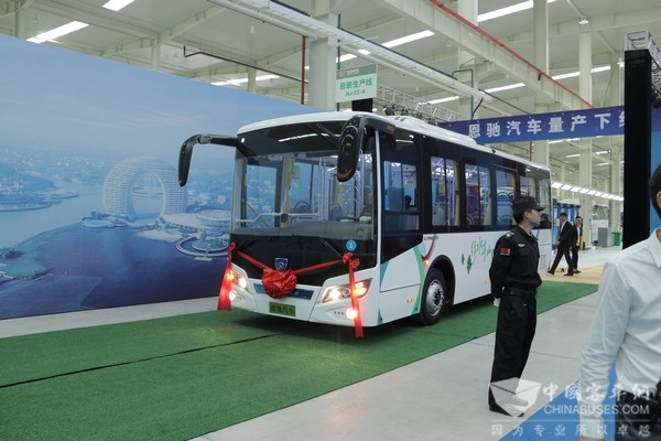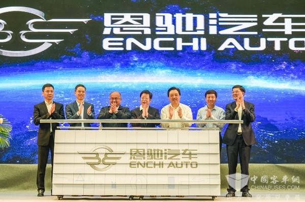 仪式现场,地方各级领导分别发表了讲话,十点整,各级领导在所有来宾见证下共同推动发车杆,一台崭新的恩驰新能源公交车驶出总装线,象征恩驰汽车正式量产上市,交付使用。