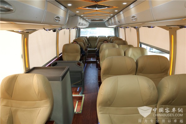 在为重庆渝快行旅游服务有限公司提供转型旅游用车整体解决方案时,是以高质量旅游客运为切入口,探索游客“体验游”的模式,打造“渝快行”的旅游服务特色。用“2+1”VIP布局座位,提供远远大于普通客车的有效乘坐空间;豪华座椅靠背曲线设计,乘坐舒适;座椅后背提供液晶显示屏,8国语言的大片,让旅客乘车也能影音娱乐;米色内饰车厢,搭配车顶及左右两侧独特彩条氛围灯设计,温馨典雅、艺术气息十足;高铁遮阳帘、航空式行李舱,堪比高铁商务座、航空头等舱;车内配备有卫生间,让旅途更便捷、更人性化、更舒心。