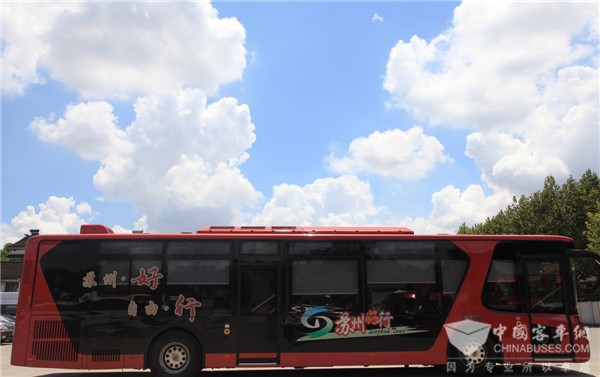 而在“苏州好行”的解决方案中,则是强调苏州的旅游文化元素,让“上有天堂、下有苏杭”的文化气息散落在“苏州好行”车辆上的每一个角落。深灰色玻璃和车身侧围涂装共同构成象征苏州古城文明的扇面形状。扇面左侧,以虎丘塔和湖水组成的“苏州好行”Logo历历在目;车厢内顶两侧空调风道灯箱饰有苏州代表性景区彩照,可在需要时转换为车辆运行线路牌,灯箱和司机座位背后的玻璃板四角用金属镶嵌出了苏州古典窗棂的花样,尽显吴韵姑苏元素。