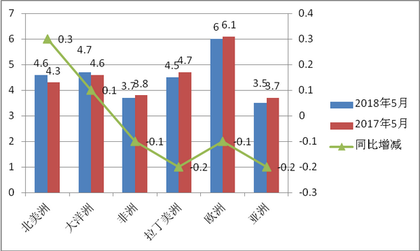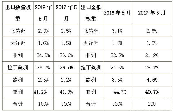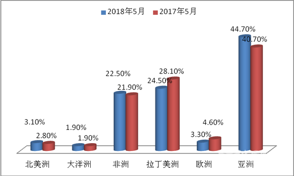 1、上图表数据表明,2018年5月我国客车出口主要集中在亚洲、拉丁美洲和非洲,这三个大洲出口数量占比为近93.2%,但同比2017年的93.8%却下降了0.6个百分点。