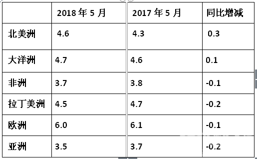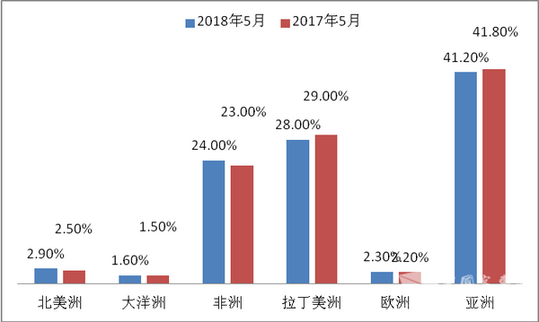 二、2018年5月中国客车出口流向地区份额解析---亚洲权重最大,其次是美洲,再次是非洲