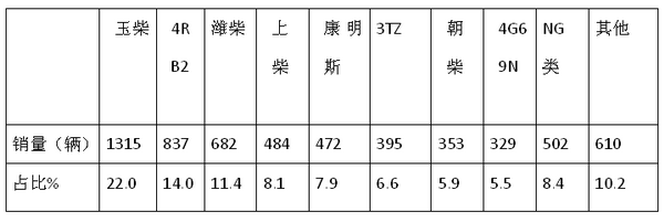 2、 汽油类中,绵阳4RB2机器占比最大,其次是重型汽油机3TZ,再次是三菱发动机4G69N.