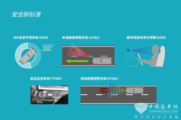 另外,360环视、LCWS、FCWS、DDW、TPMS等多项安全装备和技术的保护,让海格新能源客车更安全更可靠。