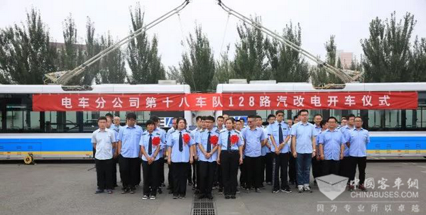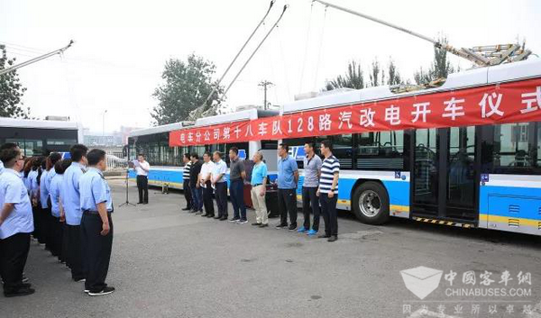北京电车分公司相关领导、教练员、原128路汽车驾驶员给新电车驾驶员颁授钥匙,寓意企业将线路的运输任务交于他们,使新电车驾驶员不忘创建核心区首善标准的纯绿色公交运营企业的重任。128路车队队长带领全体新电车驾驶员进行了开车前的宣誓,将为乘客提供绿色、安全、优质的公交服务责任牢记于心。