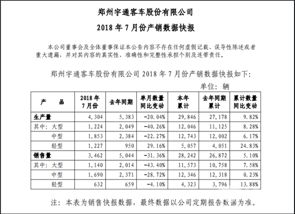 从各细分车型来看,宇通2018年7月份生产大型客车4304辆,较2017年同期单月同比下降20.04%;宇通大型客车销售3462辆,较去年同期5044辆的销量有着31.36%的降幅。反观2018年前7月,宇通累计生产大型客车12046辆,累计销售大型客车11573辆,分别实现了8.28%和7.58%的增幅。