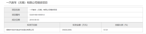 据北京产权交易所官网公示信息显示,湖南中车时代电动汽车股份有限公司(以下简称中车电动) 以3.96亿元的投资金额,持股一汽客车(无锡)有限公司(以下简称一汽锡客)57.01%的股份,增资项目已于8月3日完成交易。此次,增持后中车电动将成为一汽锡客的控股股东。