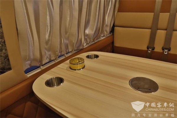 在生活舱里,有两排双人座椅,并且都拥有各自独立的桌子,这个比较有意思,一般都是卡座对向共用桌子的,不过这个前面一排的不算桌子,而是生活舱到驾驶舱的一个半隔断,当然也可以当桌子用。同样,这个椅子可以前后翻转,让它与最后面的椅子形成对坐状态,这样就变成面对面卡座了。