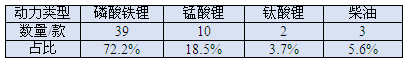 从电池类型看,在51款新能源客车产品中,磷酸铁锂电池依然是主流,其中39款搭载磷酸铁锂电池,占比72.2 %。有10款客车搭载锰酸锂电池,占比 18.5%,2款广通牌纯电动客车搭载钛酸锂电池。