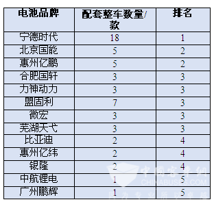 从电池品牌看,有13家电池配套企业为本批客车提供电池。宁德时代、北京国能、惠州亿鹏、合肥国轩、盟固利、微宏等动力电池数量较多。在51款新能源客车中,选择宁德时代磷酸铁锂电池的18款,排名第一;选择北京国能和惠州亿鹏电池的客车都是5款,位列第二,合肥国轩、力神动力、盟固利、微宏、芜湖天弋分别配套3款,位列第三。