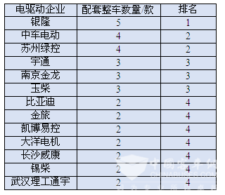 本次申报的新能源客车中,参与配套的电驱动品牌多达26家,这比电池品牌高出了一倍。其中,银隆为自家客车配套5款,位列第一;中车电动和苏州绿控分别配套4款整车,位列第二;宇通、南京金龙、玉柴电驱动分别配套了3款客车,排名第三;比亚迪、金旅、凯博易控、长沙威康、大洋电机、锡柴、武汉理工通宇分别为2款客车配套电驱动,位列第四。