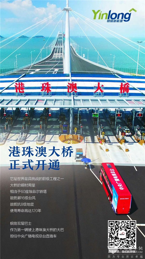 快来跟随银隆双层巴士,欣赏伶仃洋上的美景,一睹港珠澳大桥的风采!(p.s.:扫描下方二维码观看央视直播)