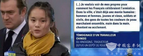 同时,法国一所国际学校8名法国高中生朗读了6段记录一战停战日场景的文字,从平凡人的视角展现百年前人们对和平的渴望,其中一篇书信出自一位中国劳工之手,这也是一战中国劳工这一特殊群体首次在法国国家层面的一战纪念活动中获得承认。