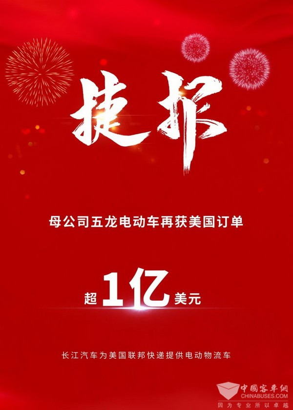 2018年11月14日,长江汽车母公司五龙电动车(00729.HK)发布公告称,集团在美国子公司Chanje的合作伙伴Ryder向公司订购电动物流车,该批电动物流车将出租给FedEx(联邦快递),预计该订单将为集团带来不少于100,000,000美元的销售收入。根据订单,长江汽车母公司五龙电动车美国子公司Chanje将于2019年10月20日前交付75%的电动物流车,于2020年6月20日前交付剩下的25%,该批电动物流车均将由长江汽车生产制造。