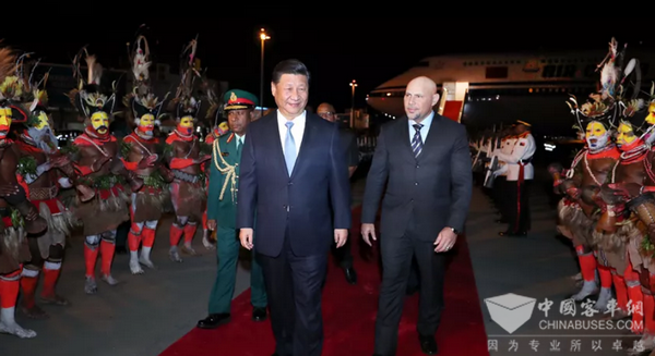 当地时间2018年11月15日晚8时05分许,习近平主席乘坐的专机抵达莫尔兹比港杰克逊国际机场。习主席步出舱门,现场响起热烈的掌声,巴布亚新几内亚副总理埃布尔率政府高级官员在舷梯旁热情迎接。巴布亚新几内亚少年向习主席献上鲜花。红地毯两侧,英姿飒爽的礼兵昂首伫立,另一端, 8辆金龙捷冠为主的迎宾车队,齐整威武,严阵以待。在巴新热情洋溢的迎宾仪式后,8辆金龙捷冠搭载中国代表团列队驶出,当地民众、中资企业员工和华侨华人簇拥在机场外和中国代表团下榻处欢迎。